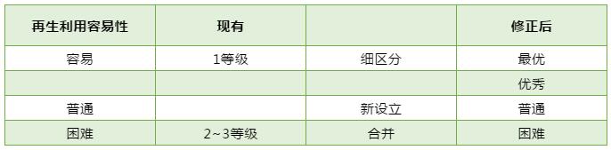 ????????在該修正案中, 將9種包裝材質再生利用等級從1~3等級改進為最優,優秀,普通,差4個級別,將原來的1等級分解成最優和優秀,2~3等級合并成差,增加了普通等級。