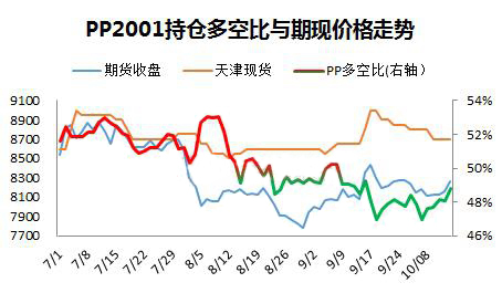 ????????第二、7月以來多空比曲線下行過程中,PP期現價格并不同步,多空比形成階段性底部和頂部相對領先,在50%臨界線之下,多單逐步增加,多空比逐步提升,此時配合基本面情況,有擇機介入短多的機會。多空比在8月22日達到階段性底部48.5%,之后開始一波反彈,多空比的底部領先期現價格一周左右時間,8月28日PP2001收盤7833元/噸,華東現貨在9月3日8600元/噸,相繼形成底部;9月6日,持倉多空比50.3%形成階段性頂部,且50%臨界線之上僅僅維持兩天就再次轉頭下行,此次多空比領先了期現價格10天左右。總之當多空比、期貨和現貨價格同向而行,“共振”之際,方可順勢而為。