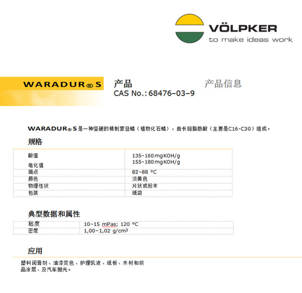 WARADUR RS是一種精制的,非常堅硬的褐煤蠟(化石植物蠟),由長鏈脂肪酸(主要是C16-C30)組成。作為高性能潤滑劑。可用于溶劑型分散體。