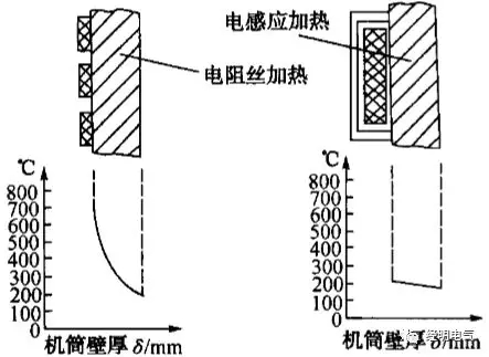 圖1 電阻加熱器和感應加熱器加熱機筒時的溫度梯度