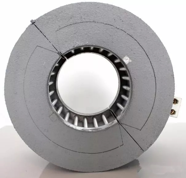 ????????傳統(tǒng)加熱圈通過接觸傳導方式把熱量傳遞到機筒,其中有一半的熱量散發(fā)到了空氣中;保溫型的紅外線加熱圈,發(fā)熱效率高,導向性的輻射可將熱量直接轉換成機筒上的溫度,避免熱量的散發(fā)。其外觀結構如圖5、圖6、圖7。