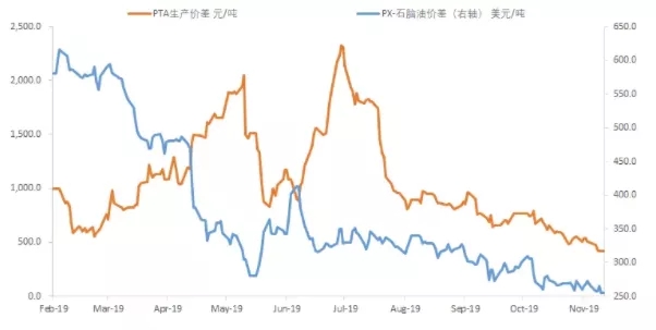 ????????整個產(chǎn)業(yè)上游都在擴張,而終端的需求一直不景氣,這種情形下,依靠變化莫測的原油市場和個別裝置檢修一兩周對市場預(yù)期也不會有太大的影響。而目前進入2019年年尾,今年P(guān)TA價格不斷創(chuàng)出新低。PTA價格重心下移的原因十分明顯,主要是大量PTA新裝置、尤其是大煉化配套PX新裝置年內(nèi)持續(xù)投產(chǎn)。