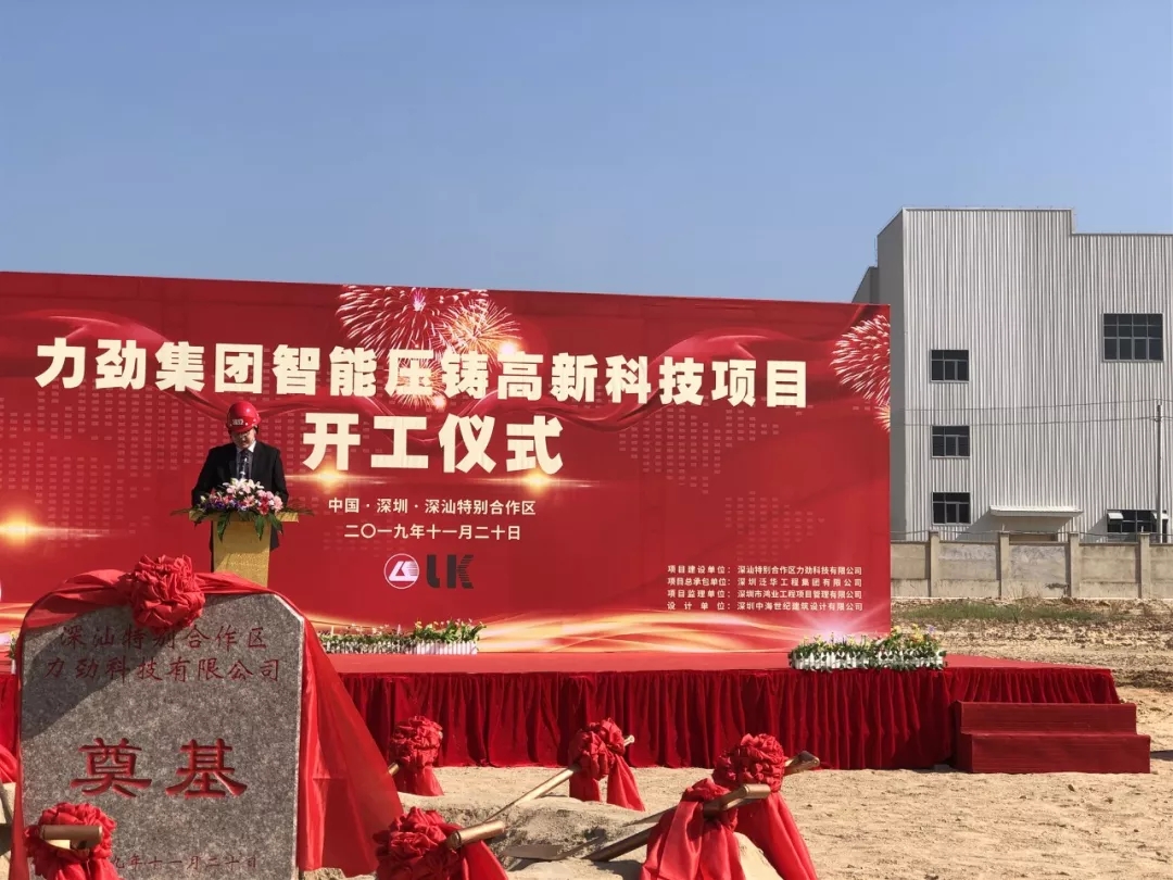 ????????11月20日,位于深汕特別合作區的力勁集團智能壓鑄高新科技項目正式啟動,開工奠基儀式在今天舉行。力勁集團創始人劉相尚先生、CEO劉卓銘先生、力勁集團深圳領威科技有限公司總經理潘玲玲女士、華南市場部總監鄧毅明先生及項目總承包單位相關負責人等參加。