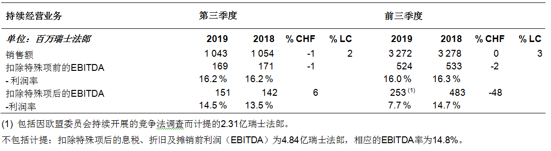 ????????· 持續(xù)經(jīng)營業(yè)務(wù)扣除特殊項(xiàng)(不包括歐盟委員會計(jì)提)后息稅、折舊及攤銷前利潤(EBITDA)穩(wěn)定在4.84億瑞士法郎