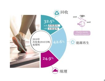 ????????2018年歐洲共收集了2910萬噸廢塑料,其中32.5%的廢塑料進行了回收再生,42.6%的廢塑料進行了能源轉換,24.9%的廢塑料進行了填埋處理。
