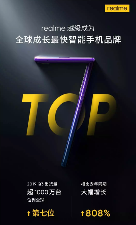 ????????據Counterpoint最新調研報告:realme手機第三季度出貨量超1000萬臺,同比增長808%,位列全球前7,成為全球成長最快的智能手機品牌。
