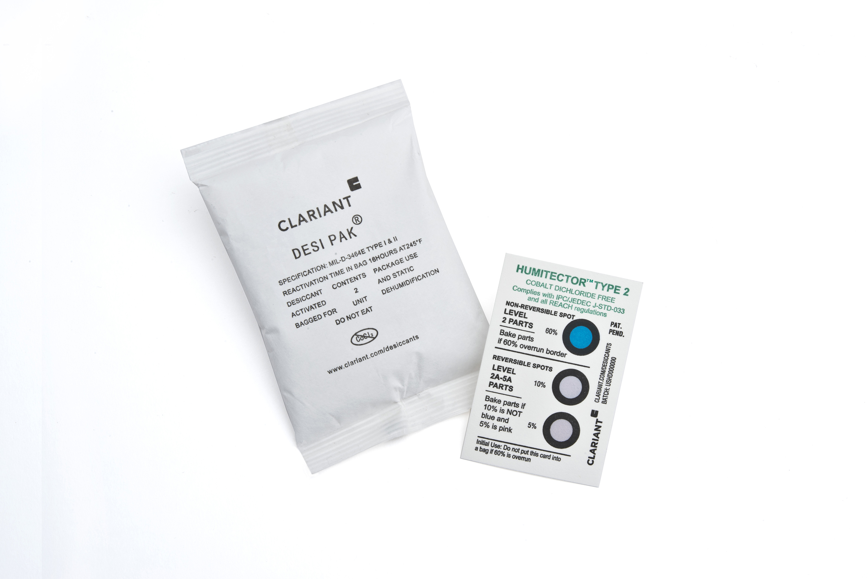 ????????為了緩解此類問題,行業標準要求將SMD置于防潮包裝(干燥包裝)中進行運輸和存儲。“干燥包裝”由防潮袋、干燥劑(如科萊恩的Desi Pak? 膨潤土干燥劑)和濕度指示卡(如科萊恩的Humitector)組成。濕度指示卡可以通過在不同的濕度環境中濕敏色點顏色的變更,指示環境中是否存在水分。傳統上,這些指示色點中的濕敏材料使用的是鹵素化合物,例如二溴化鈷(CoBr2)、二氯化銅(CuCl2)或二溴化銅(CuBr2)。