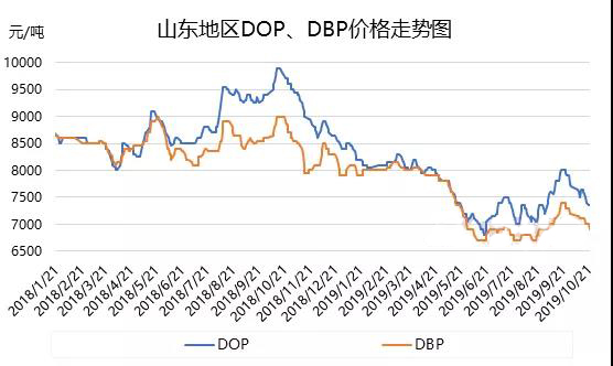 ????????如上圖所示,國內(nèi)DOP、DBP價格亦是不斷下行。就DOP而言,行業(yè)供應(yīng)充足,去庫存阻力重重,為減緩出貨阻力,市場低價不斷增加,疊加原料辛醇及苯酐跌勢,偏空情緒維持,愈跌愈不買跌始終貫穿。但跌至目前價位:山東7300-7500元/噸自提,江蘇7500元/噸自提,華南7800-7900元/噸送到,加之辛醇尚未有新低價出現(xiàn),帶動一定維價,今日走勢呈現(xiàn)平穩(wěn),雖然接近心理價位,但缺乏實質(zhì)利好基礎(chǔ)上,仍多謹(jǐn)慎。就DBP而言,行業(yè)整體開工負荷不高,庫存壓力不大,且原料丁醇及萘系苯酐,一走勢基本平穩(wěn),一走勢破位下行,導(dǎo)致市場雖然下行,但波動基本窄幅度。