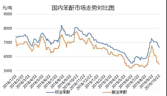 ????????如上圖所示,為鄰法苯酐與萘法苯酐走勢圖,鄰法苯酐與萘法苯酐皆是下行,其中萘系苯酐跌勢快速,前期漲幅盡數(shù)回吐,且苯酐行業(yè)跌勢恐將延續(xù)。萘系苯酐破位下行,跌勢過程中,多次引發(fā)觸底情緒,但皆以失敗告終,原料工業(yè)萘讓利下行,但跌勢節(jié)奏遠不及萘系苯酐,故虧損情況依舊明顯,截止今日,山西潞寶及山西金源工業(yè)萘招標(biāo)皆是流拍,對市場利空打壓維持。伴隨萘系苯酐大跌及鄰法苯酐陰跌,鄰萘法苯酐創(chuàng)的最大價差,超1000元/噸價差,過大價差對鄰法苯酐利空沖擊明顯。在下游DOP及相關(guān)萘系苯酐跌勢打壓下,鄰法苯酐亦是不斷下探,部分倒掛現(xiàn)象出現(xiàn),故對中石化鄰苯仍有下調(diào)預(yù)期。總體而言,苯酐行業(yè)探底走勢仍將持續(xù)。