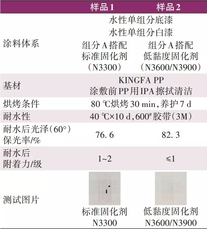 ????????在保險杠清漆體系中,采用低黏度固化劑,不僅能有效降低清漆中有機溶劑的含量,降低VOC排放,而且在性能方面也具有很大的改善,例如保光性、附著力和耐水性能。表2為采用相同的水性單組分底漆、水性單組分色漆以及清漆的A組分,樣品1使用的是標準三聚體的固化劑,樣品2采用的是低黏度固化劑[m(N3600)∶m(N3900)=1∶1混拼]。