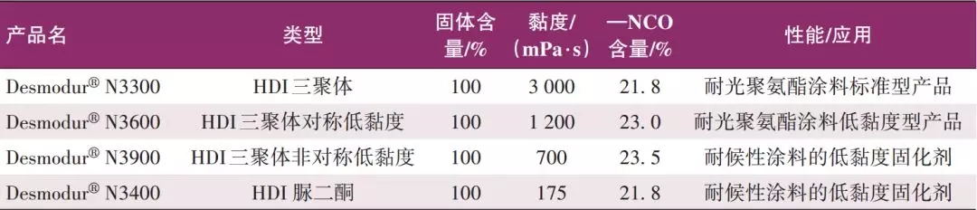 ????????保險杠用清漆體系,目前以溶劑型雙組分聚氨酯涂料為主。2006年曾有水性高光清漆用于塑料涂裝,但是由于施工可操作性的限制,并未得到廣泛應用。在VOC法規的推動下,為進一步降低VOC排放,高固清漆成為研究熱點。采用低黏度的固化劑可使用較少溶劑即能調節涂料至施工黏度,顯著減少溶劑的使用,并達到較高的施工固含。表1為科思創推出的可用于保險杠高固清漆配方的固化劑產品。