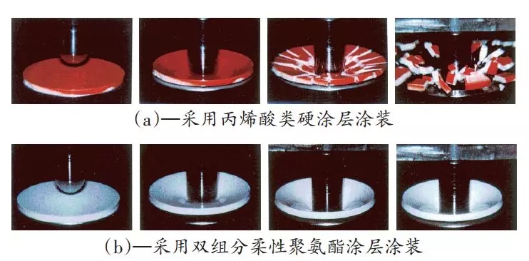 ????????底漆通常有淺灰色和深灰色,也有采用與色漆顏色類似或相同的顏色。底漆的主要功能在于有效覆蓋塑料底材缺陷,并能提高基材附著力。對于保險杠底漆來說,還要具備優良的重涂性、耐水性、以及低溫耐沖擊能力等。對于汽車而言,保險杠還要求具有良好的安全功能。所以保險杠涂料還必須具備一定的外力緩沖作用,從而起到對駕駛員和乘車者的防護。聚氨酯底漆的韌性正能滿足這一要求,水性聚氨酯底漆性能尤佳。圖6是不同涂層對塑料基材的保護效果實驗。