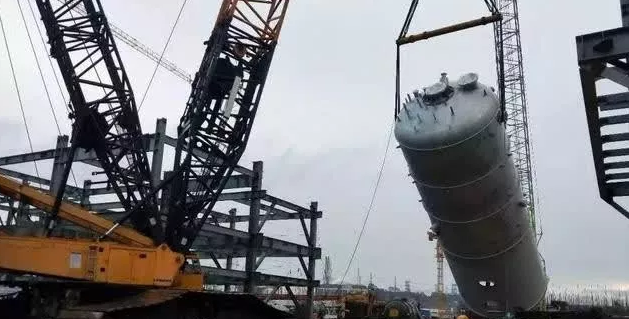 12月21日,福建百宏石化年產250萬噸精對苯二甲酸PTA項目的第一臺大型設備“第三CTA結晶器”順利吊裝成功。本設備凈重121.4t,直徑6.5米,高18.2米,主吊選用利勃海爾750噸履帶吊,溜尾選用180噸履帶吊。