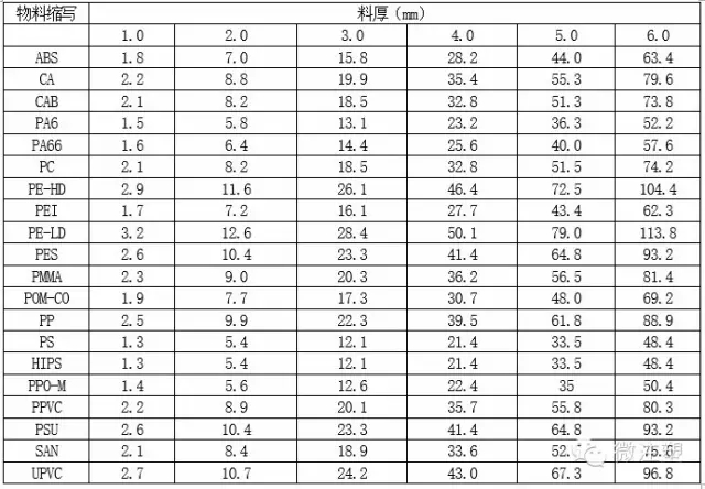通用塑料不同料厚的冷卻時間(秒)