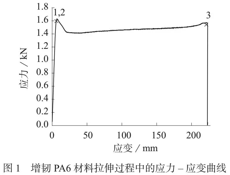 ????????拉伸強度在材料拉伸曲線中的位置如圖1 中的1 點所示。從表1 可以看到,一次擠出過程得到的增韌PA6 材料的拉伸強度為48.18 MPa,但是經過二次擠出過程后,增韌PA6 材料的拉伸強度下降為41.47 MPa。
